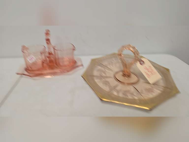 Possible Pink Depression Glass Creamer, Sugar, and Snack Tray