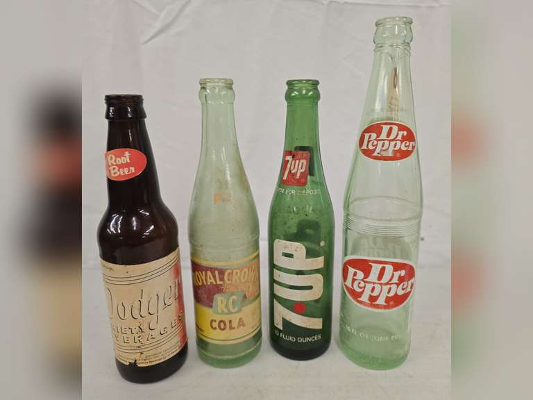 Dr. Pepper 16 oz, Dodger Root Beer 12 oz, Royal Crown 20 oz, 7up 10 oz bottles