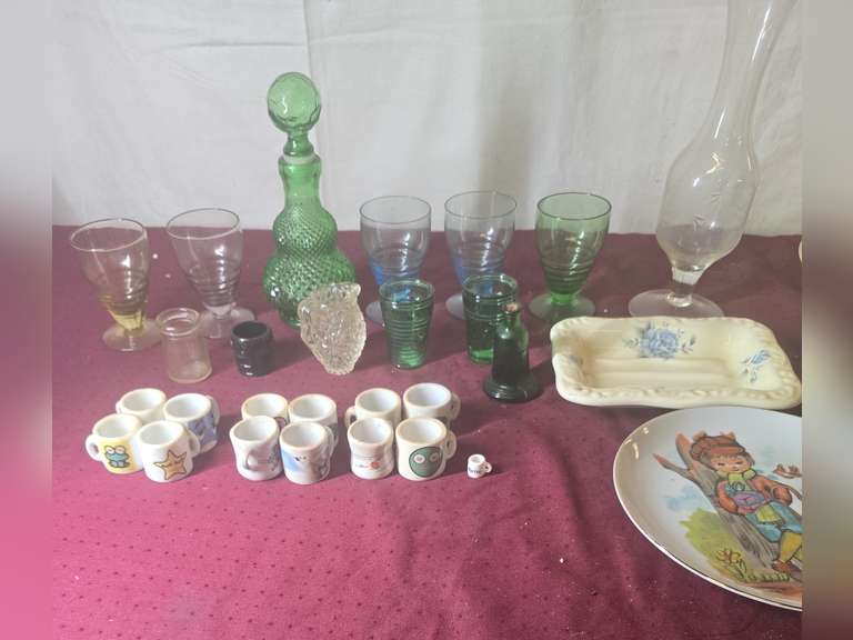 Assorted collectibles, mini cups, green glasses, etc