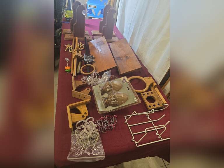 Wooden shelves, wall hangings, etc