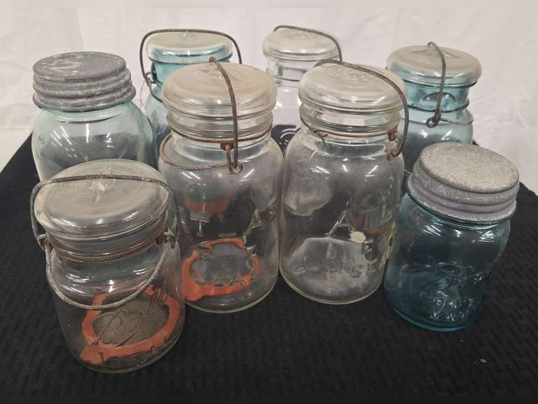8 Vintage canning jars, glass lids, wire bails, quarts and pints, aqua and clear