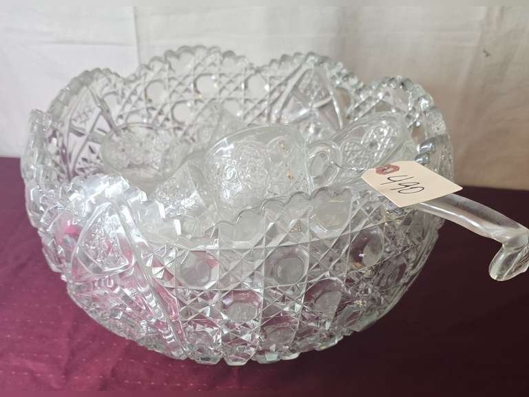 LOT 490 - Vintage glass punch bowl with cups and glass ladle