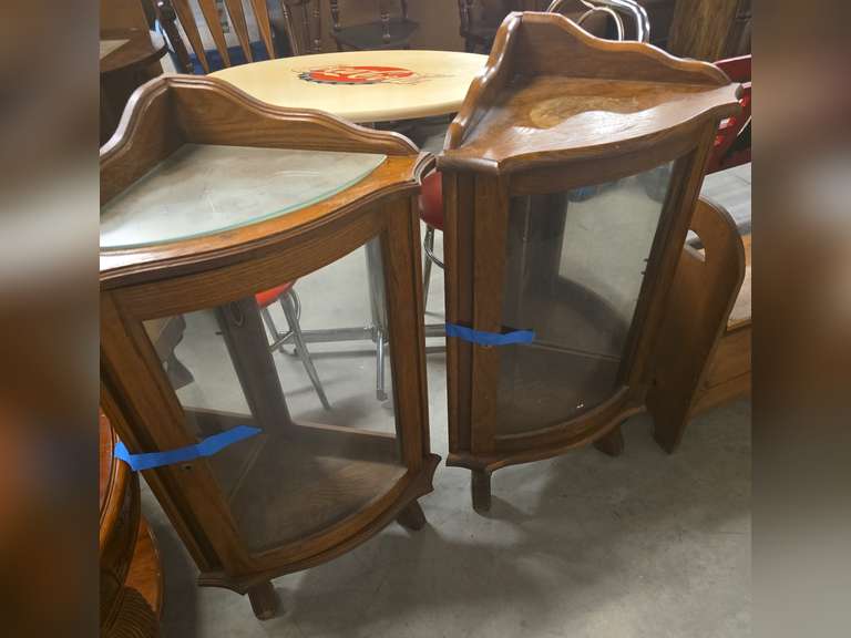2 Matching corner cabinets, glass shelves, approximately 14x36