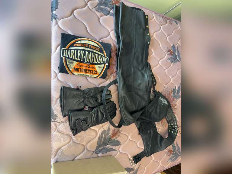 Chaps - size medium, gloves and a Harley Davidson T Shirt