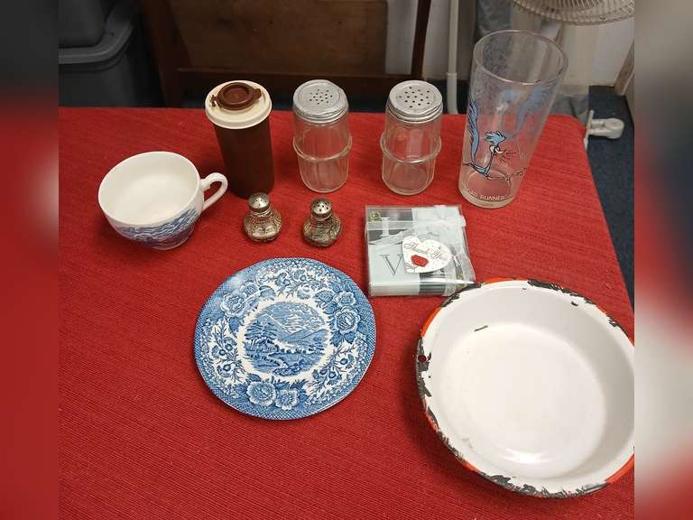 Cups and Saucer, Salt and Pepper Shaker and Enamelware Bowl