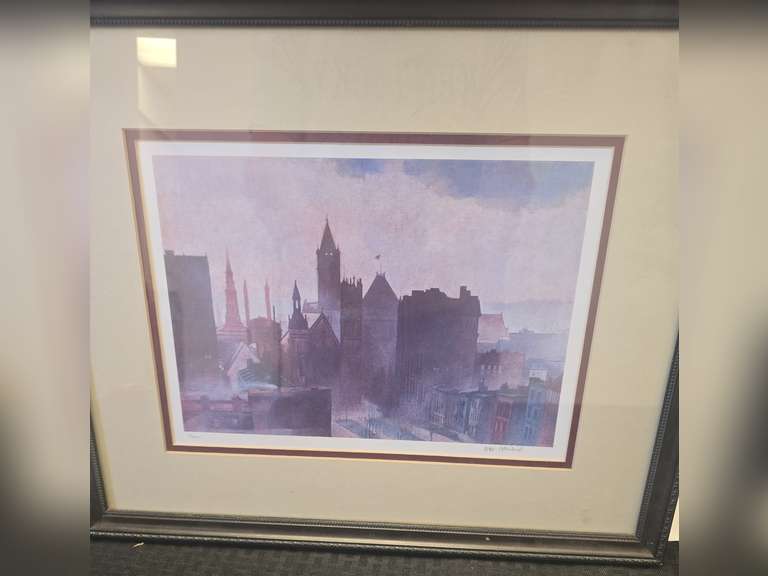 Framed, signed William Hillenbrand, numbered 1/1000, city skyline, approximately 15x18