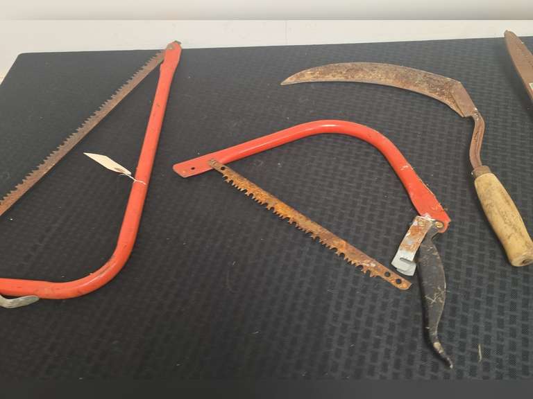LOT 680 - Sickle, copper, fan belt, bow saws