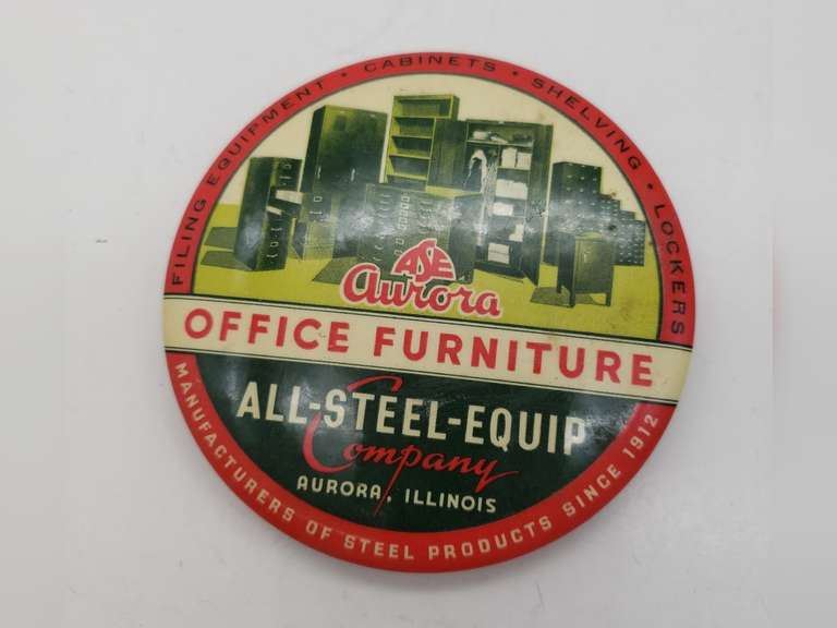 Aurora Office Furniture Circa 1935 Celluloid Advertising Paperweight, Aurora, Illinois. 3 1/2" Diameter