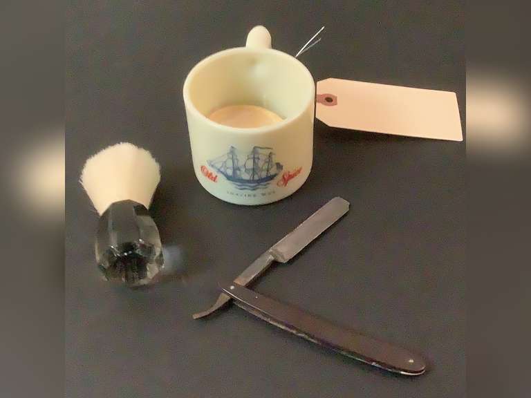 LOT 2209 - Old Spice shaving mug, soap, brush and straight razor.