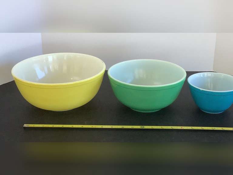 5”, 8” & 10” Pyrex colored mixing bowls. Paint has been rubbed off the edge of the 5” bowl.